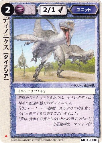 ![]() ![]() | MC3-072 ディノニクス ユニット 英雄王の星誕 ▲ 属性:風 種族:ダイナソア レベル:(2) 攻撃力:2 防御力:1 進軍タイプ:歩行 イニシアチブ:+2 岩陰からちらっと見えたのは、小さいボディに秘めた加速が魅力のディノニクス。 「肉じゃー!・・・・・・拙僧、久しぶりに肉を食したいと進言する次第でございますよ!」 「貴様、食事を必要としない私への当てつけか?」 ――七星魔導史 マフィン伝 illustrated by 緑川美帆 |
