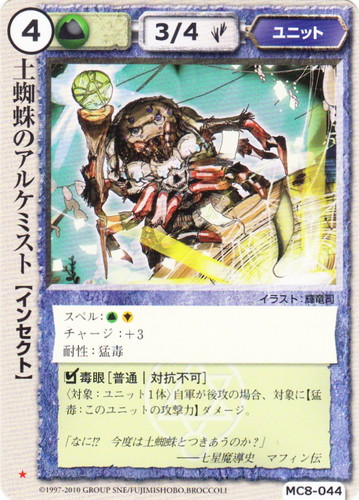 ![]() ![]() | MC8-044 土蜘蛛のアルケミスト ユニット 伏龍殿の覇者 ★ 属性:土 種族:インセクト レベル:4 攻撃力:3 防御力:4 進軍タイプ:歩行 スペル:土聖 チャージ:+3 耐性:猛毒 □毒眼[普通|対抗不可] 〈対象:ユニット1体〉自軍が後攻の場合、対象に【猛毒:このユニットの攻撃力】ダメージ。 「なに!?今度は土蜘蛛とつきあうのか?」 ――七星魔導史 マフィン伝 illustrated by 輝竜司 |