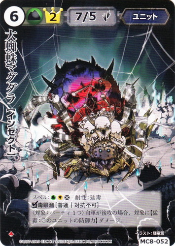 ![]() ![]() | MC8-052 大蜘蛛マグダラ ユニット 伏龍殿の覇者 ♣ 属性:土 分類:英雄 種族:インセクト レベル:6 英雄点:2 攻撃力:7 防御力:5 進軍タイプ:歩行 スペル:土聖* 耐性:猛毒 □毒眼瘤[普通|対抗不可] 〈対象:パーティ1つ〉自軍が後攻の場合、対象に【猛毒:このユニットの防御力】ダメージ。 「マグダラ・・・・・・あくまで人間を許さないのか」 ――七星魔導史 マフィン伝 illustrated by 輝竜司 |