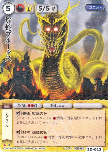 ![]() ![]() | 2D-012 焔蛇ブルータス ユニット ヴァローカの精霊祭 ♣ 属性:火 分類:英雄 種族:レプタイル ブロック:II レベル:5 英雄点:1 攻撃力:5 防御力:5 進軍タイプ:歩行 スペル:火火* 耐性:火炎 □[普通]獄焔の牙 〈コスト:このユニットの火消費/対象:敵軍ユニット1体〉 対象に【火炎:20】ダメージ。 □[対抗]焔鱗絞め 〈コスト:このユニットの火消費/対象:攻撃中の敵軍ユニット1体〉 対象に【火炎:20】ダメージ。 illustrated by 開田裕治 |