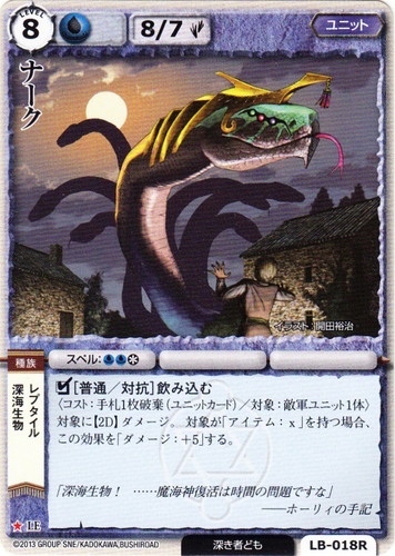 ![]() ![]() | LB-018R ナーク ユニット 不滅なる聖騎士 ★ 属性:水 種族:深海生物/レプタイル ブロック:LE レベル:8 攻撃力:8 防御力:7 進軍タイプ:歩行 勢力:深き者ども スペル:水水* □[普通/対抗]飲み込む 〈コスト:手札1枚破棄(ユニットカード)/対象:敵軍ユニット1体〉 対象に【2D】ダメージ。対象が「アイテム:x」を持つ場合、この効果を「ダメージ:+5」する。 「深海生物!・・・・・・魔海神復活は時間の問題ですな」 ――ホーリィの手記 illustrated by 開田裕治 |