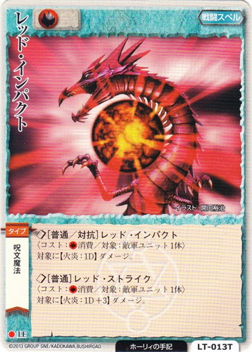![]() ![]() | LT-013T レッド・インパクト 戦闘スペル ホーリィの手記 ● 属性:火 ブロック:LE 勢力:ホーリィの手記 タイプ:呪文魔法 ◇[普通/対抗]レッド・インパクト 〈コスト:火消費/対象:敵軍ユニット1体〉 対象に【火炎:1D】ダメージ。 ◇[普通]レッド・ストライク 〈コスト:火消費/対象:敵軍ユニット1体〉 対象に【火炎:1D+3】ダメージ。 illustrated by 開田裕治 |