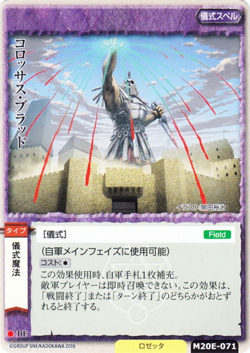 ![]() ![]() | M20E-071 コロッサス・ブラッド 儀式スペル モンスター・コレクションDeus ● 種族:儀式魔法 ブロック:DE 勢力:ロゼッタ [儀式]【Field】 (自軍メインフェイズに使用可能) コスト:(*) この効果使用後、自軍手札1枚補充。敵軍プレイヤーは即時召喚できない。この効果は、「戦闘終了」または「ターン終了」のどちらかがおとずれると終了する。 illustrated by 開田裕治 |