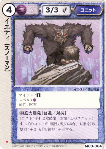 ![]() ![]() | MC8-067 ビッグフット ユニット 伏龍殿の覇者 ★ 属性:風 種族:スノーマン レベル:4 攻撃力:3 防御力:3 進軍タイプ:歩行 スペル:水風風 耐性:吹雪 □冷凍光線[普通] 〈対象:パーティ1つ〉対象に【吹雪:このユニットの防御力】ダメージ。 illustrated by 開田裕治 |