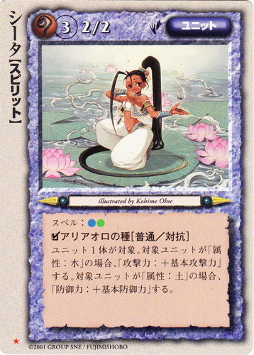 ![]() ![]() | シータ ユニット 魔法帝国の興亡 ★ 属性:魔 種族:スピリット レベル:3 攻撃力:2 防御力:2 進軍タイプ:歩行 スペル:水土 □アリアオロの種[普通/対抗] ユニット1体が対象。対象ユニットが「属性:水」の場合、「攻撃力:+基本攻撃力」する。対象ユニットが「属性:土」の場合、「防御力:+基本防御力」する。 illustrated by Kohime Ohse |