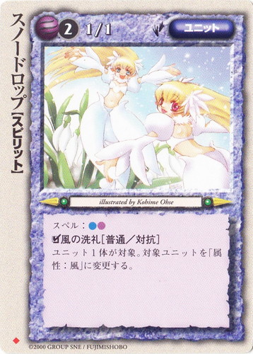 ![]() ![]() | スノードロップ ユニット 太陽王の覚醒 ◆ 属性:風 種族:スピリット レベル:(2) 攻撃力:1 防御力:1 進軍タイプ:歩行 スペル:水土 □風の洗礼[普通/対抗] ユニット1体が対象。対象ユニットを「属性:風」に変更する。 illustrated by Kohime Ohse |