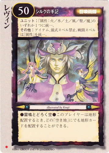 ![]() ![]() | レヴィン 召喚術師 魔法帝国の興亡 ✡ デック枚数:50 勢力:シルクの手記 ユニット:「属性:火/水/土/風/聖/魔」のいずれか1つに統一。 その他:アイテム、儀式スペル禁止。戦闘スペルは「属性」を統一。 ●雷鳴とどろく空●このプレイヤーは地形配置するとき、その「空き地」にでも地形カードを配置することができる。 illustrated by Kouji |