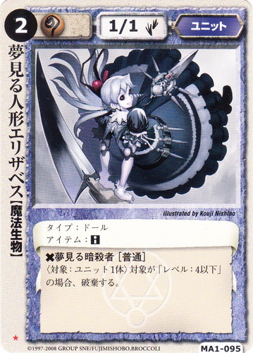 ![]() ![]() | MA1-SP4 夢見る人形エリザベス ユニット プロモーションカード(ブロッコリー) ★ 属性:魔 種族:魔法生物 レベル:(2) 攻撃力:1 防御力:1 進軍タイプ:歩行 タイプ:ドール アイテム:■ ×夢見る暗殺者[普通] 〈対象:ユニット1体〉対象が「レベル:4以下」の場合、破棄する。 illustrated by Kouji Nishino |