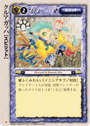 ![]() ![]() | クルアガッハ ユニット 魔法帝国の興亡 ▲ 属性:聖 種族:スピリット レベル:(2) 攻撃力:2 防御力:2 進軍タイプ:歩行 □ふくみわらい[イニシアチブ/対抗] プレイヤー1人が対象。対象プレイヤーが振ったダイス目1つを「1D」に変更する。 illustrated by Ryuusuke Mita |