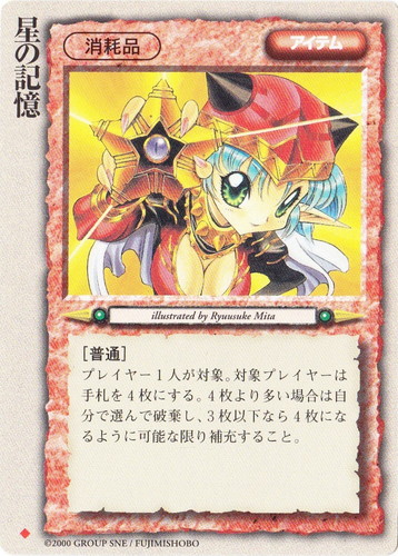 ![]() ![]() | 星の記憶 アイテム 太陽王の覚醒 ◆ 分類:消耗品 [普通] プレイヤー1人が対象。対象プレイヤーは手札を4枚にする。4枚より多い場合は自分で選んで破棄し、3枚以下なら4枚になるように可能な限り補充すること。 illustrated by Ryuusuke Mita |