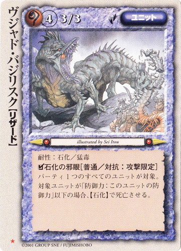 ![]() ![]() | ヴジャド・バジリスク ユニット ビギナーズ・セット(ファイア・ドラゴン) ★ 属性:魔 種族:リザード レベル:4 攻撃力:3 防御力:3 進軍タイプ:歩行 耐性:石化/猛毒 □石化の邪眼[普通/対抗:攻撃限定] パーティ1つのすべてのユニットが対象。対象ユニットが「防御力:このユニットの防御力」以下の場合、【石化】で死亡させる。 illustrated by Sei Itou |