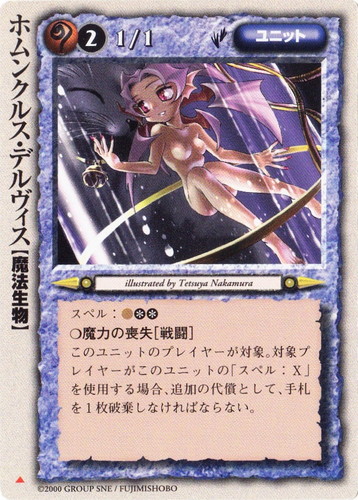![]() ![]() | ホムンクルス・デルヴィス ユニット 放浪王の帰還 ▲ 属性:魔 種族:魔法生物 レベル:(2) 攻撃力:1 防御力:1 進軍タイプ:歩行 スペル:魔** ○魔力の喪失 このユニットのプレイヤーが対象。対象プレイヤーがこのユニットの「スペル:X」を使用する場合、追加の代償として、手札を1枚破棄しなければならない。 illustrated by Tetsuya Nakamura |
