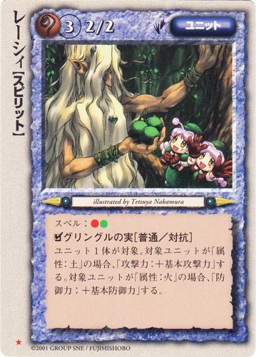 ![]() ![]() | レーシィ ユニット 魔法帝国の興亡 ★ 属性:魔 種族:スピリット レベル:3 攻撃力:2 防御力:2 進軍タイプ:歩行 スペル:火土 □グリングルの実[普通/対抗] ユニット1体が対象。対象ユニットが「属性:土」の場合、「攻撃力:+基本攻撃力」する。対象ユニットが「属性:火」の場合、「防御力:+基本防御力」する。 illustrated by Tetsuya Nakamura |