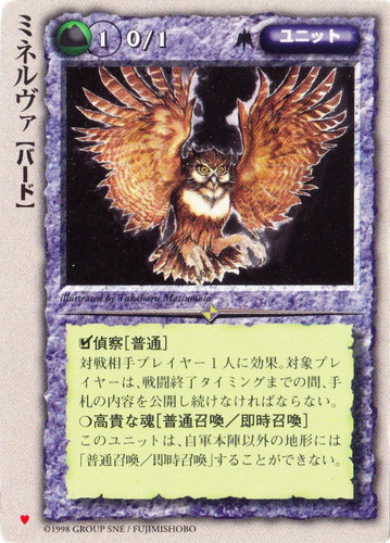 ![]() ![]() | ミネルヴァ ユニット 聖都の決闘者(リコル) ♥ 属性:土 種族:バード レベル:1 攻撃力:0 防御力:1 進軍タイプ:長距離飛行 □偵察[普通] 対戦相手プレイヤー1人に効果。対象プレイヤーは、戦闘終了タイミングまでの間、手札の内容を公開し続けなければならない。 ○高貴な魂[普通召喚/即時召喚] このユニットは、自軍本陣以外の地形には「普通召喚/即時召喚」することができない。 illustrated by Takaharu Matsumoto |