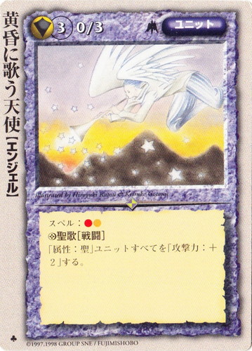 ![]() ![]() | 黄昏に歌う天使 ユニット モンスター・コレクション ♣ 属性:聖 種族:エンジェル レベル:3 攻撃力:0 防御力:3 進軍タイプ:長距離飛行 スペル:火聖 ◎聖歌[戦闘] 「属性:聖」ユニットすべてを「攻撃力:+2」する。 illustrated by Hiroyuki Katou&Keisuke Gotou |