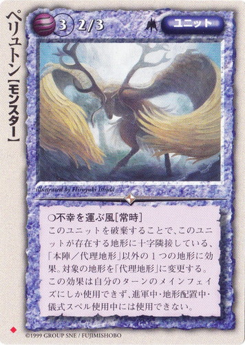 ![]() ![]() | ペリュトン ユニット 黄金樹の守護者 ◆ 属性:風 種族:モンスター レベル:3 攻撃力:2 防御力:3 進軍タイプ:長距離飛行 ○不幸を運ぶ風[常時] このユニットを破棄することで、このユニットが存在する地形に十字隣接している、「本陣/代理地形」以外の1つの地形を「代理地形」に変更する。 この効果は自分のターンのメインフェイズにしか使用できず、進軍中・地形配置中・儀式スペル使用中には使用できない。 illustrated by Hiroyuki Ishida |