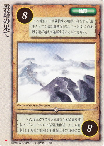 ![]() ![]() | 雲路の果て 地形 黄金樹の守護者 ▲ リミット:8 この地形に十字隣接する地形に存在する「進軍タイプ:長距離飛行」のユニットは、この地形を飛び越えて進軍することができない。 illustrated by Masahiro Satou |