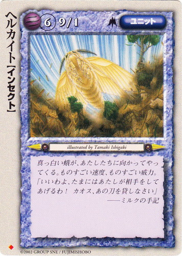 ![]() ![]() | ヘルカイト ユニット 冥界の六皇子 ◆ 属性:風 種族:インセクト レベル:6 攻撃力:9 防御力:1 進軍タイプ:長距離飛行 真っ白い蛾が、あたしたちに向かってやってくる。ものすごい速度、ものすごい威力。 「いいわよ、たまにはあたしが相手をしてあげるは!カオス、あの刀を貸しなさい」 ――ミルクの手記 illustrated by Tamaki Ishigaki |
