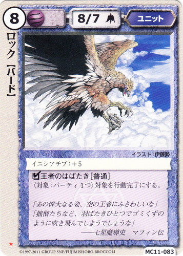 ![]() ![]() | MC11-083 ロック ユニット 暗黒卿の秘儀 ★ 属性:風 種族:バード レベル:8 攻撃力:8 防御力:7 進軍タイプ:長距離飛行 イニシアチブ:+5 □王者のはばたき[普通] 〈対象:パーティ1つ〉対象を行動完了にする。 「あの偉大なる姿、空の王者にふささわしいな」 「拙僧たちなど、羽ばたきひとつでゴミくずのように吹き飛んでしまうでしょうな」 ――七星魔導史 マフィン伝 illustrated by 伊藤勢 |
