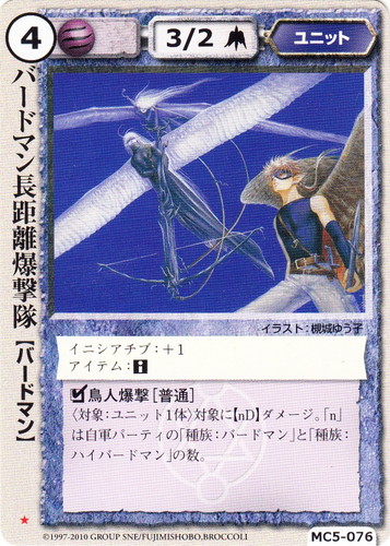 ![]() ![]() | MC5-076 バードマン長距離爆撃隊 ユニット 星剣姫の烙印 ★ 属性:風 種族:バードマン レベル:4 攻撃力:3 防御力:2 進軍タイプ:長距離飛行 イニシアチブ:+1 アイテム:■ □鳥人爆撃[普通] 〈対象:ユニット1体〉対象に【nD】ダメージ。「n」は自軍パーティの「種族:バードマン」と「種族:ハイバードマン」の数。 illustrated by 槻城ゆう子 |