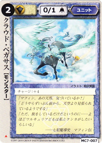![]() ![]() | MC7-007 クラウド・ペガサス ユニット 蒼天界の神馬 ▲ 属性:聖 種族:モンスター レベル:(2) 攻撃力:0 防御力:1 進軍タイプ:長距離飛行 チャージ:+4 「マフィン、あの天馬、気づいているか?」 「どうやらずいぶん前から、天空より見張られているようですな」 「ただ、旅をしているだけだというのに・・・・・・よほどワルキュリアどもは私とケンカがしたいらしいな」 ――七星魔導史 マフィン伝 illustrated by 相沢美良 |