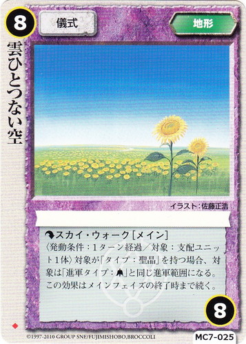 ![]() ![]() | MC7-025 雲ひとつない空 地形 蒼天界の神馬 ◆ 分類:儀式 リミット:8 ▼スカイ・ウォーク[メイン] 〈発動条件:1ターン経過/対象:支配ユニット1体〉対象が「タイプ:聖晶」を持つ場合、対象は「進軍タイプ:長距離飛行」と同じ進軍範囲になる。この効果はメインフェイズの終了時まで続く。 illustrated by 佐藤正浩 |