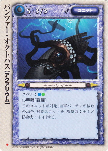 ![]() ![]() | パンツァー・オクトパス ユニット 冥界の六皇子 ★ 属性:水 種族:アクアリウム レベル:5 攻撃力:3 防御力:3 進軍タイプ:歩行 スペル:水土 ○甲殻[戦闘] このユニットが対象。自軍パーティが後攻の場合、対象ユニットを「攻撃力:+4/防御力:+4」する。 illustrated by Yuji Kaida |