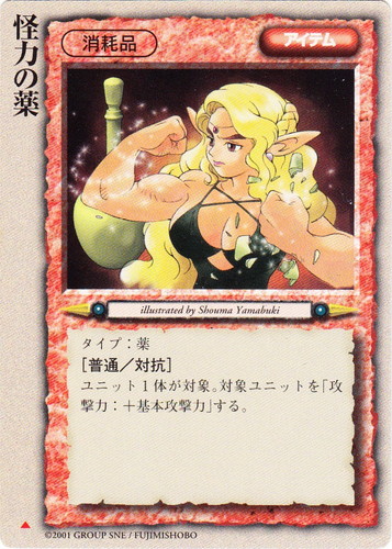 ![]() ![]() | 怪力の薬 アイテム モンスター・コレクション2 ▲ 分類:消耗品 タイプ:薬 [普通/対抗]] ユニット1体が対象。対象ユニットを「攻撃力:+基本攻撃力」する。 illustrated by Michio Murakawa |