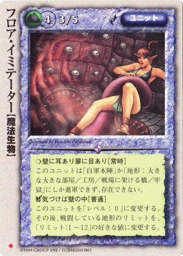![]() ![]() | フロア・イミテーター ユニット 空中庭園の降臨 ◆ 属性:土 種族:魔法生物 レベル:4 攻撃力:3 防御力:5 進軍タイプ:歩行 ○壁に耳あり扉に目あり[常時] このユニットは「自軍本陣」か「地形:大きな大きな部屋/工房/戦場に架ける橋/牢獄」にしか進軍できず、存在できない。 □気づけば壁の中[普通] このユニットを「レベル:0」に変更する。その後、戦闘している地形のリミットを、「リミット:1~12」の好きな値に変更する。 illustrated by Jun-ichi Fujikawa |