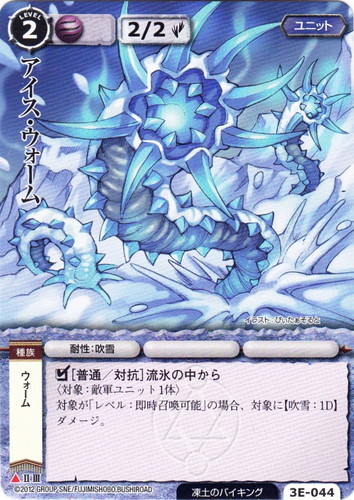 ![]() ![]() | 3E-044 アイス・ウォーム ユニット 竜神殿の巫女 ▲ 属性:風 種族:ウォーム ブロック:II/III レベル:(2) 攻撃力:2 防御力:2 進軍タイプ:歩行 勢力:凍土のバイキング 耐性:吹雪 □[普通/対抗]流氷の中から 〈対象:敵軍ユニット1体〉 対象が「レベル:即時召喚可能」の場合、対象に【吹雪:1D】ダメージ。 illustrated by ぴぃたぁそると |