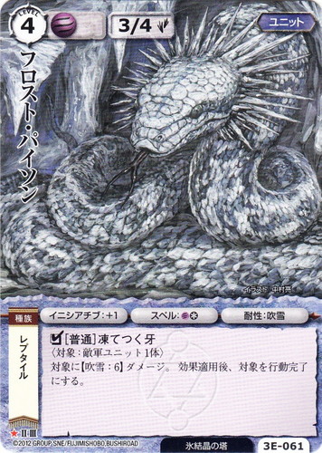 ![]() ![]() | 3E-061 フロスト・パイソン ユニット 竜神殿の巫女 ★ 属性:風 種族:レプタイル ブロック:II/III レベル:4 攻撃力:3 防御力:4 進軍タイプ:歩行 勢力:氷結晶の塔 イニシアチブ:+1 スペル:風* 耐性:吹雪 □[普通]凍てつく牙 〈対象:敵軍ユニット1体〉 対象に【吹雪:6】ダメージ。効果適用後、対象を行動完了にする。 illustrated by 中村亮 |