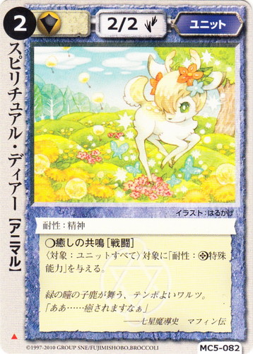 ![]() ![]() | MC5-082 スピリチュアル・ディアー ユニット 星剣姫の烙印 ▲ 属性:聖 種族:アニマル レベル:(2) 攻撃力:2 防御力:2 進軍タイプ:歩行 耐性:精神 ○癒やしの共鳴[戦闘] 〈対象:ユニットすべて〉対象に「耐性:◎特殊能力」を与える。 緑の瞳の子鹿が舞う、テンポよいワルツ。 「ああ・・・・・・癒やされますなぁ」 ――七星魔導史 マフィン伝 illustrated by はるかげ |
