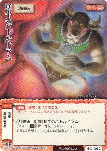 ![]() ![]() | 4C-092 猛牛のバトルドラム アイテム サザンの聖角獣 ★ 分類:消耗品 ブロック:III/IV 勢力:炎のラビリンス タイプ:魔法工芸品/楽器 【秘伝】「種族:ミノタウロス」(使用ユニットにこの種族が含まれていなければ使用できない) ◇[普通/対抗]猛牛のバトルドラム 〈コスト:■消費/対象:自軍パーティ〉 対象に「攻撃力:+3」または「防御力:+3」を付与する。 illustrated by 巴ヨシヤス |