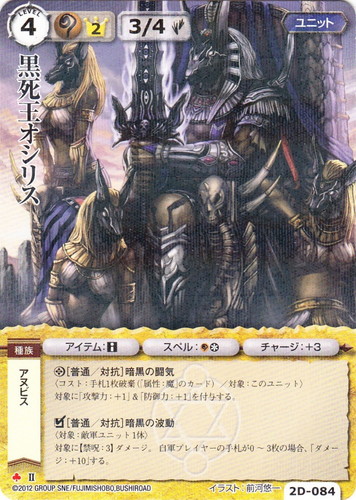 ![]() ![]() | 2D-084 黒死王オシリス ユニット ヴァローカの精霊祭 ♣ 属性:魔 分類:英雄 種族:アヌビス ブロック:II レベル:4 英雄点:2 攻撃力:3 防御力:4 進軍タイプ:歩行 アイテム:■ スペル:魔* チャージ:+3 ◎[普通/対抗]暗黒の闘気 〈コスト:手札1枚破棄(「属性:魔」のカード)/対象:このユニット〉 対象に「攻撃力:+1」&「防御力:+1」を付与する。 □[普通/対抗]暗黒の波動 〈対象:敵軍ユニット1体〉 対象に【禁呪:3】ダメージ。自軍プレイヤーの手札が0~3枚の場合、「ダメージ:+10」する。 illustrated by 前河悠一 |