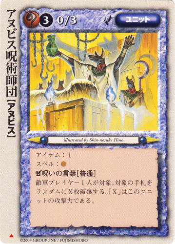 ![]() ![]() | アヌビス呪術師団 ユニット 時間獣の封印 ▲ 属性:魔 種族:アヌビス レベル:(3) 攻撃力:0 防御力:3 進軍タイプ:歩行 アイテム:1 スペル:魔 □呪いの言葉[普通] 敵軍プレイヤー1人が対象。対象の手札をランダムにX枚破棄する。「X」はこのユニットの攻撃力である。 illustrated by Shin-nosuke Hino |