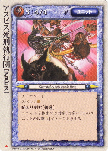 ![]() ![]() | アヌビス魔剣士団 ユニット 魔法帝国の興亡 ◆ 属性:魔 種族:アヌビス レベル:3 攻撃力:2 防御力:3 進軍タイプ:歩行 アイテム:1 チャージ:+2 ○悪霊の召喚 このユニットのプレイヤーが対象。対象プレイヤーは、手札にある「種族:アヌビス/アンデッド」のユニット・カードを、このユニットの存在する地形に「普通召喚/即時召喚」できる。 illustrated by Masae Hashimoto |