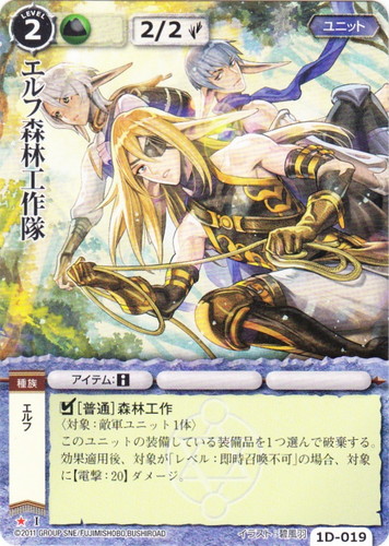 ![]() ![]() | エルフ森林遊撃隊 ユニット キャラクター・パックWHITE ▲ 属性:土 種族:エルフ レベル:(2) 攻撃力:1 防御力:1 進軍タイプ:歩行 スペル:土 □射撃[普通/対抗] ユニット1体が対象。対象ユニットが「進軍タイプ:飛行/長距離飛行」の場合、【2】ダメージを与える。 illustrated by Ichi |