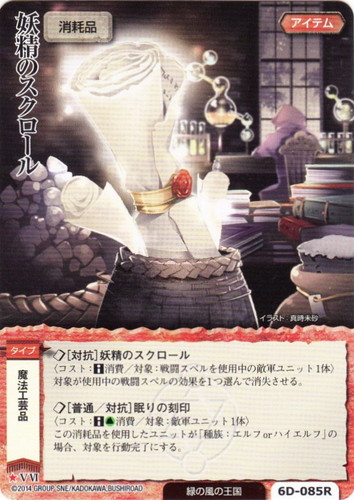 ![]() ![]() | 6D-085R 妖精のスクロール アイテム 悠久のハルシオン ★ 分類:消耗品 ブロック:V/VI 勢力:緑の風の王国 タイプ:魔法工芸品 ◇[対抗]妖精のスクロール 〈コスト:■消費/対象:戦闘スペルを使用中の敵軍ユニット1体〉 対象が使用中の戦闘スペルの効果を1つ選んで消失させる。 ◇[普通/対抗]眠りの刻印 〈コスト:■土消費/対象:敵軍ユニット1体〉 この消耗品を使用したユニットが「種族:エルフorハイエルフ」の場合、対象を行動完了にする。 illustrated by 真時未砂 |
