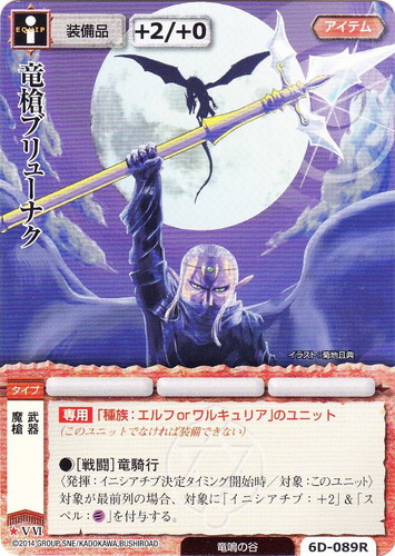 ![]() ![]() | 6D-089R 竜槍ブリューナク アイテム 悠久のハルシオン ★ 分類:装備品 ブロック:V/VI 攻撃力:+2 防御力:+0 勢力:竜鳴の谷 タイプ:魔槍/武器 コスト:■ 【専用】「種族:エルフorワルキュリア」のユニット(このユニットでなければ装備できない) ●[戦闘]竜騎行 〈発揮:イニシアチブ決定タイイング開始時/対象:このユニット〉 対象が最前列の場合、対象に「イニシアチブ:+2」&「スペル:風」を付与する。 illustrated by 菊地且典 |