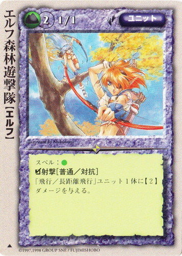 ![]() ![]() | エルフ森林遊撃隊 ユニット モンスター・コレクション2 ▲ 属性:土 種族:エルフ レベル:(2) 攻撃力:1 防御力:2 進軍タイプ:歩行 スペル:土 □射撃[普通/対抗] ユニット1体が対象。対象ユニットが「進軍タイプ:飛行/長距離飛行」の場合、【2】ダメージを与える。 illustrated by Shikidouji |