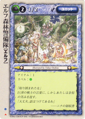 ![]() ![]() | エルフ森林警備隊 ユニット モンスター・コレクション ▲ 属性:土 種族:エルフ レベル:2 攻撃力:1 防御力:2 進軍タイプ:歩行 アイテム:1 スペル:土 illustrated by Shikidouji |