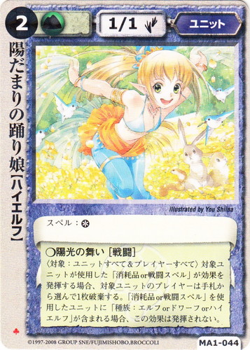 ![]() ![]() | MA1-044 陽だまりの踊り娘 ユニット 神霊獣の咆哮 ♣ 属性:土 種族:ハイエルフ レベル:(2) 攻撃力:1 防御力:1 進軍タイプ:歩行 スペル:* ○陽光の舞い[戦闘] 〈対象:ユニットすべて&プレイヤーすべて〉 対象ユニットが使用した「消耗品or戦闘スペル」が効果を発揮する場合、対象ユニットのプレイヤーは手札から選んで1枚破棄する。「消耗品or戦闘スペル」を使用したユニットに「種族:エルフorドワーフorハイエルフ」が含まれる場合、この効果は発揮されない。 illustrated by You Shiina |