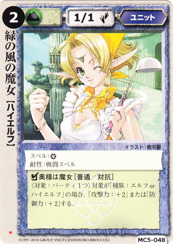 ![]() ![]() | 緑の風の王 ユニット ビギナーズ・セット(花園の歌姫) ★ 属性:土 種族:ハイエルフ レベル:(2) 攻撃力:1 防御力:1 進軍タイプ:歩行 スペル:* ○魔法耐性[戦闘] このユニットが対象。対象ユニットは戦闘スペルのダメージでは死亡しない。 ○風の旋律[戦闘] 自軍パーティのすべてのユニットが対象。対象ユニットが「種族:エルフ」の場合、「○魔法耐性[戦闘]」を得る。 illustrated by Shikidouji |