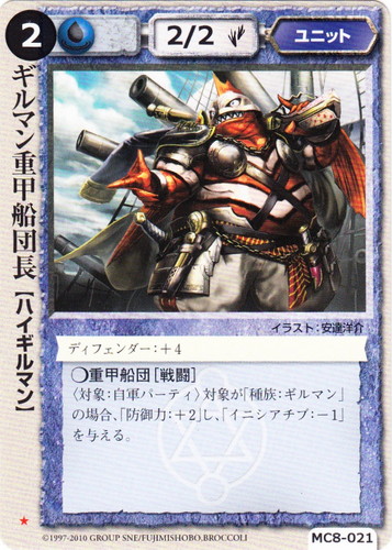 ![]() ![]() | MC8-021 ギルマン重甲船団長 ユニット 伏龍殿の覇者 ★ 属性:水 種族:ハイギルマン レベル:(2) 攻撃力:2 防御力:2 進軍タイプ:歩行 ディフェンダー:+4 ○重甲船団[戦闘] 〈対象:自軍パーティ〉対象が「種族:ギルマン」の場合、「防御力:+2」し、「イニシアチブ:-1」を与える。 illustrated by 安達洋介 |