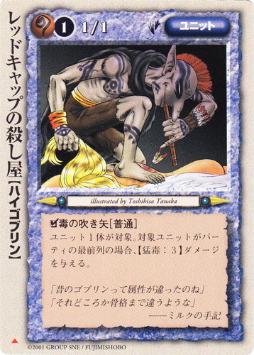 ![]() ![]() | レッドキャップの殺し屋 ユニット 魔法帝国の興亡 ▲ 属性:魔 種族:ハイゴブリン レベル:(1) 攻撃力:1 防御力:1 進軍タイプ:歩行 □毒の吹き矢[普通] ユニット1体が対象。対象ユニットがパーティの最前列の場合、【猛毒:3】ダメージを与える。 「昔のゴブリンって属性が違ったのね」 「それどころか骨格まで違うような」 ――ミルクの手記 illustrated by Toshihisa Tanaka |