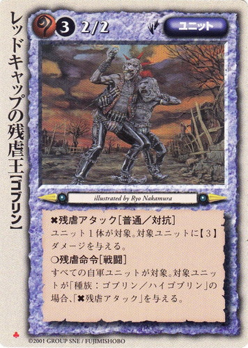 ![]() ![]() | レッドキャップの残虐王 ユニット 魔法帝国の興亡 ♣ 属性:魔 種族:ゴブリン レベル:(3) 攻撃力:2 防御力:2 進軍タイプ:歩行 ×残虐アタック[普通/対抗] ユニット1体が対象。対象ユニットに【3】ダメージを与える。 ○残虐命令[戦闘] すべての自軍ユニットが対象。対象ユニットが「種族:ゴブリン/ハイゴブリン」の場合、「×残虐アタック」を与える。 illustrated by Ryo Nakamura |