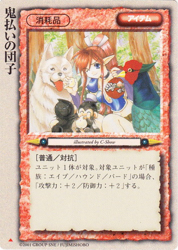 ![]() ![]() | 鬼払いの団子 アイテム 古代帝国の遺産 ◆ 分類:消耗品 [普通/対抗] ユニット1体に効果。対象ユニットが「種族:エイプ/バード/ハウンド」の場合、「攻撃力:+2/防御力:+2」する。 illustrated by Ryou Sasaki |