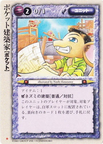 ![]() ![]() | ポケット建築家 ユニット 灼熱の百年戦争 ★ 属性:風 種族:ポケット レベル:(2) 攻撃力:0 防御力:1 進軍タイプ:歩行 アイテム:1 □ネズミの建築[普通/対抗] このユニットのプレイヤーが対象。対象プレイヤーは、自軍スロットに配置されている、裏向きのカード1枚を選び、手札に戻す。 illustrated by Naoko Kanazawa |