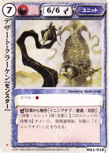 ![]() ![]() | MA1-018 デザート・クラーケン ユニット 神霊獣の咆哮 ★ 属性:火 種族:モンスター レベル:7 攻撃力:6 防御力:6 進軍タイプ:歩行 スペル:火 □砂漠から触手[イニシアチブ/普通/対抗] 〈対象:ユニット1体〉対象に【このユニットの攻撃力】ダメージ。効果適用後、対象に「イニシアチブ:-3」を与える。 illustrated by Hitoshi Yoneda |