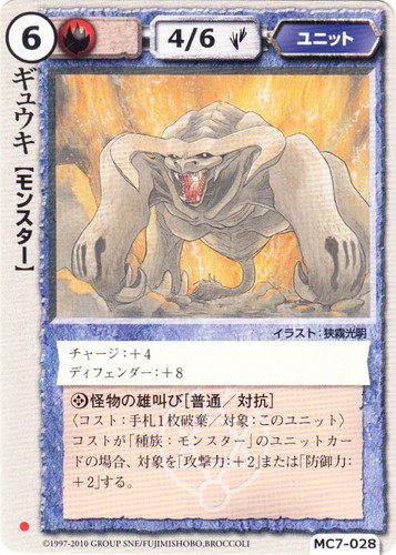 ![]() ![]() | MC7-028 ギュウキ ユニット 蒼天界の神馬 ● 属性:火 種族:モンスター レベル:6 攻撃力:4 防御力:6 進軍タイプ:歩行 チャージ:+4 ディフェンダー:+8 ◎怪物の雄叫び[普通/対抗] 〈コスト:手札1枚破棄/対象:このユニット〉コストが「種族:モンスター」のユニットカードの場合、対象を「攻撃力:;2」または「防御力:+2」する。 illustrated by 狭霧光明 |